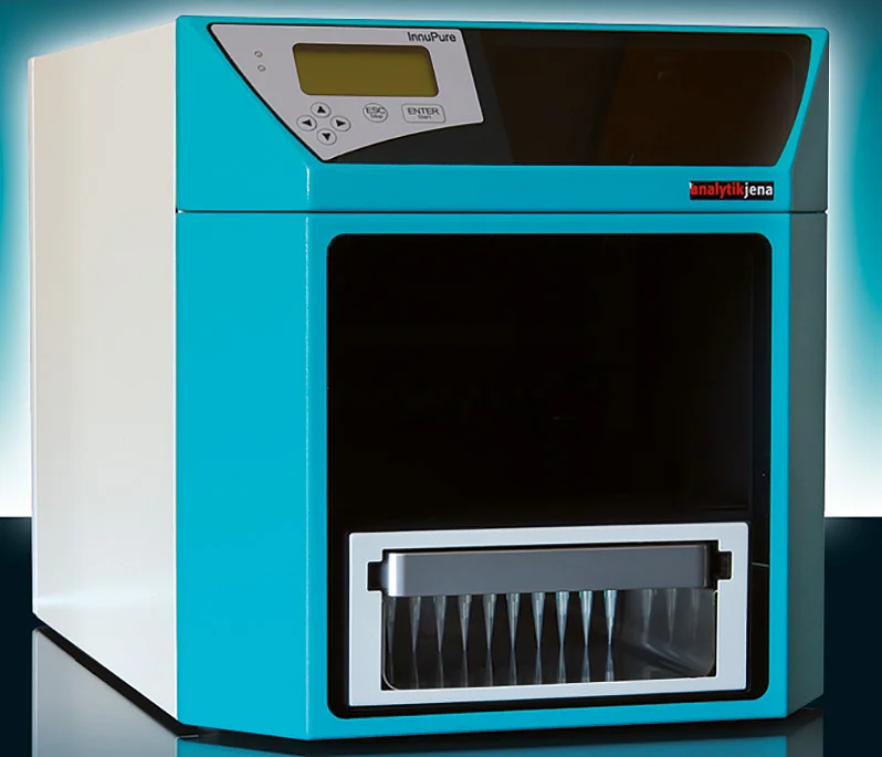 InnuPure C12 ist ein neues, flexibles und effizientes Extraktions-System für die vollautomatisierte Isolierung und Aufreinigung von Nukleinsäuren und Proteinen der AJ Cybertron, Berlin. Das in Deutschland entwickelte und produzierte System ist konzipiert für den kleinen und mittleren Probendurchsatz. Es kombiniert in bisher einmaliger Weise Liquid-Handling-Schritte mit einem extrem schnellen Walk-Away-Prinzip. Unterschiedlichste Ausgangsmaterialien können prozessiert werden.