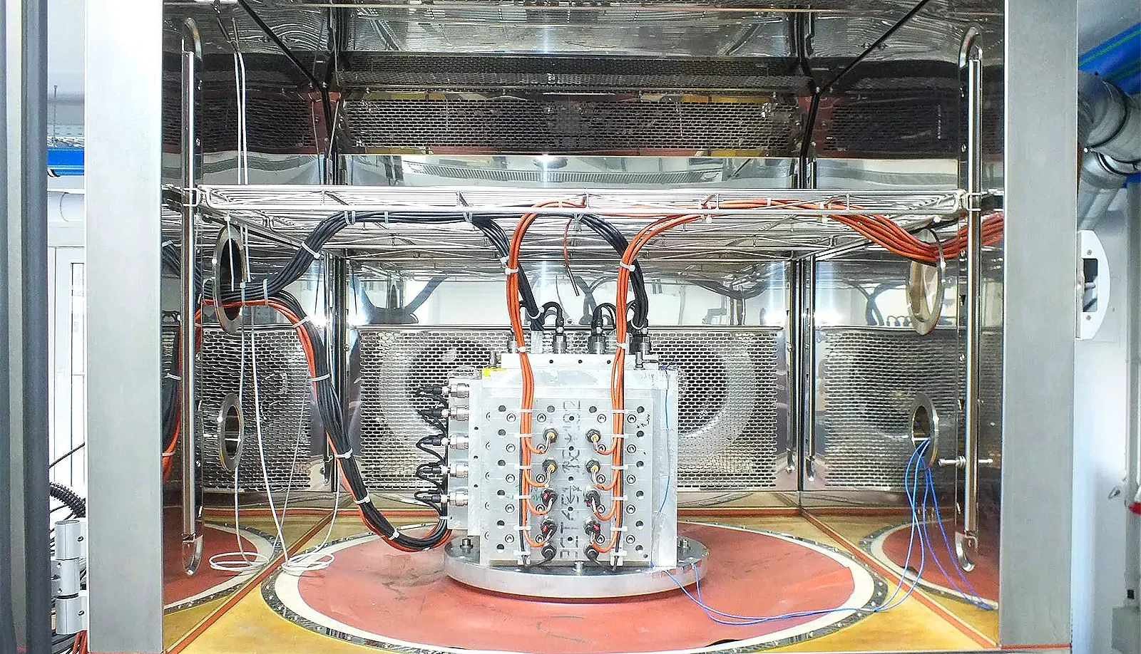 Die Ansteuerung von Prüflingen kann mit hohen Strömen, hohen Spannungen (HV) sowie Kühlwasser, Öl, Druckluft und weiteren Medien realisiert werden.